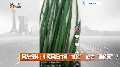 近日,有用户在短视频平台上刷到了所谓的“染色葱”,称葱被“染上蓝色”,用纸巾一擦就掉色。前后脚的时间,有网友在猪皮上发现了令他担忧的蓝色,并发图称“怎么洗也洗不掉”。